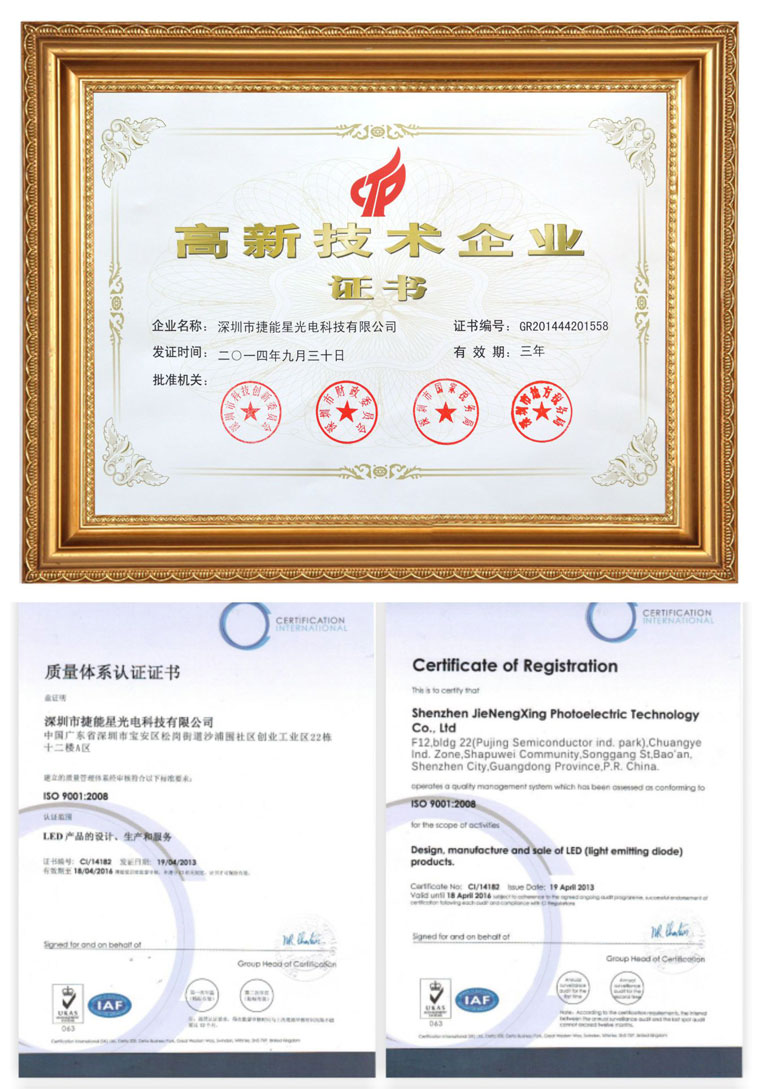 捷能星作為國家級高新技術企業在國內外大功率LED照明市場已占據很大的市場份額,已申請專利30多項,產品已通過美國UL、DLC歐盟CE、日本PSE、FCC、SAA、ROSH等國際認證。捷能星期待與全球的合作伙伴共創Led照明行業的美好未來。